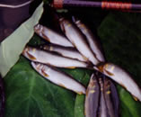 | 10年程前は、夏になったら毎日のように川に立ち、夏の間だけで数百匹の鮎を掛けていた。(鮎の友釣りの場合おとりを縄張りをもった鮎の近くに泳がせ、出て行けと体当たりしたところを針にかかりようにする)しかしここ数年というもの体当たりをしてくるような元気のいい鮎がすっかり姿を消し、一緒になかよく泳いでいる鮎ばかりになってしまった。 そして鮎釣りから遠ざかった。 いま多くの川が天然遡上の鮎ではなく、琵琶湖産の鮎、人工増殖の鮎、海産の鮎を川に放流して釣りができるようしている。その鮎たちは配合飼料で育てられた後、川に放流されるものだから、縄張りをもってえさを採ろうという意欲がなくなり、いつもみんなでなかよしこよしなのです。 私の住んでいる額田に男川という川があり、鮎のシーズンになると多く釣り人でにぎわったものでした、いまお客さんはほとんどいません。たまに地元のつり好きの老人が竿を出している程度です。 竿をひったくるような当たりや、かかった魚と一緒に川を下っていかなければ捕れないような魚はどこにいってしまったのでしょう。 鮎釣りが面白かった時代を知っていると、今の状況で竿をだそうという気持ちがわいてきません。毎年毎年今年こそ、昔のようになるのではないかと期待して川を覗くのですが、毎年がっかりです。 全国的に有名な長良川あたりでも似たような状況です。このままいけば鮎釣りを始める若い人がいなくなり、鮎の友釣りなんて伝統漁法なんてことになりそうです。 鮎の友釣りは釣りとしてもものすごく面白いし、食べてもすごくうまい魚だから、なんとかして面白さを復活してほしいです。 水産試験場、稚鮎業者がもっと工夫すれば何とかなりそうなのに(6〜7年前の状況に戻すだけ)どうしてならないのか不思議です。 あまりに寂しいから、大して釣れなくても今年からまた鮎釣りを始めようと思います。 やっぱり、夏の食卓に鮎の塩焼きは必需品です。 |