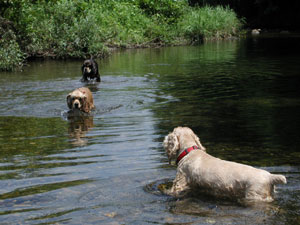 山を走ったり、川で泳いだりしている犬がきれいな毛を保つには生活の全ての時間を犬についやさなければできません。もともと猟犬だったコッカー、山や川で遊ぶの大好き。メイなど始めて見た太平洋の波に飛び込んで遊んでいました。それほど外で遊ばせるのが好きならバリバリの猟犬を飼えと言われるかもしれませんが、本気モードの猟犬ではとてもつきあい切れません。彼らの運動したい欲求は半端ではありません。散歩の距離なんてマラソンランナーでもなければつきあえません。その点アメコくらいが運動能力、大きさ、可愛さ・・・私の好みにぴったりなのです。多くのアメコの飼い主、毎日ブラッシング、定期的なシャンプー、トリミングできれいな長髪を保って、ドッグカフェでモデルデビューのようなことをしています。そんな毛で山を走らせるなんてもっての他です。そんなきれいな犬とは我が家の3ワン全く違います。