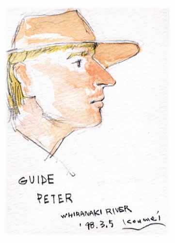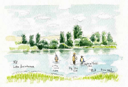 このときの釣りからスケッチが始まりました。 全てランギタイキ川やイニフィニア湖の水を使って描きました。 思い出が水とともに染みこみました。