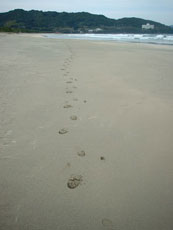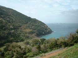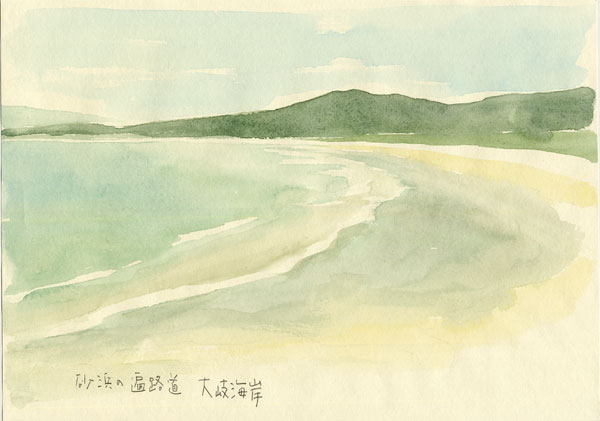 入野駅の細いベンチで寝たのですが細すぎて良く寝られなかった。マットを持ってくればと後悔。朝6時に駅を出発。渡し船か橋で四万十川を渡るのですが、時間の関係で橋を選ぶ。(渡しに乗りたかった)始めての四万十、大きな川である。なぜか足が軽いので今日の宿を40キロ先の民宿Aに予約。30キロまでは快調だったがその後マメはでき、足はすっかり重くなった。だめおしに大岐の海岸が遍路道になっていて、2.5キロの砂浜を歩いたのです。砂浜が終わったところにはロープがあるではありませんか、ロープにしがみついて岩の坂を上がれというのです。なかなかうれしいことをしてくれます。へろへろになりながら民宿Aに到着。