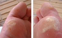 右足の小指、親指の付け根、かかとと3ヶ所にマメができてしまい歩くとかなり痛い。いままでは2日もすると固まっていたのだが今回は固まった横に新たなマメが次々と。 |