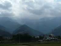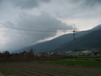 昨日の夜の雨が石鎚の山々の頂上付近は雪で白くなっている、愛知県よりずっと寒い。桜は全く咲いていない。 |