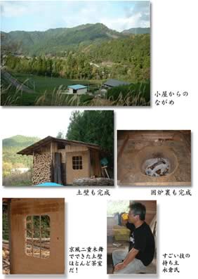 秋、陶芸に気を入れていて、小屋作り作業をすっかりさぼっていました。その間にも、仲間達はこつこつと進めていました。なんと土壁が完成していました。囲炉裏も完成です。なかなかカッコいいです。しかしまだ窓がついていません。まあ窓というより跳ね上げ式の木の戸をつけるだけですから、もうすぐです。後はトイレ!