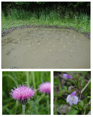 田んぼの回りはアザミやサギゴケなど野草がいっぱい。