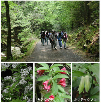 自然体験リーダーとしての源流探訪も2回目、今回は中学生が30名、大人10名、40名を引率しての山案内。新緑の中、本宮山頂上をめざしての山歩き。鳥やカエルがにぎやかに鳴いています。ウツギやガマズミが満開。春の山は本当にきれい。山道の脇には男川が流れ、アマゴの姿も見られます。でもここは禁漁区、釣りはダメ。