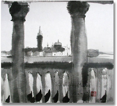 ヨーロッパの風景を水墨画で描いてみたかったので、これ幸いとベネチィアを水墨で描いてみました。