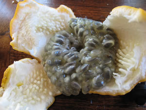 2月4日 南の島に行くとみたこともない果物がいっぱいある。 写真はマルキッサという果物。 おそるおそる口にしてみる。 口に甘すっぱい果汁が広がり、一安心。 しかしどう見てもカエルの卵だ。 |