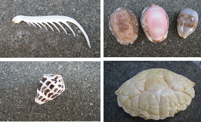 過去に拾ったもの。「シラナミガイ」「グンカン鳥のくちばし」「カニのチョキ」