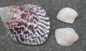 今回は第二次大戦の激戦地だったペリリュー島の海岸で「サラサバテイラ」(写真左)と「カワラガイ」(右)を拾いました。