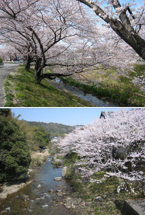 ・伊賀川は桜吹雪で川がピンク色。散り際の艶姿。