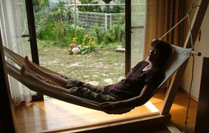 9月23日 先日作ったハンモックハンガーの高さが少々足りなかったのでアームの部分を長い木に差し替え。 ハンモックがゆったりした感じになった。 かなかな調子いいそうです。 秋風に吹かれて昼寝。 |