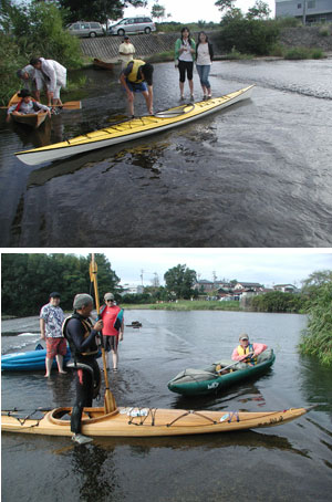 9月27日 友人の手作りカヤックの進水式。 白と黄色のかわいいシーカヤック。 下の写真のカヤックも手作り。 |