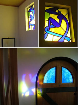 あまりに感激し、そろそろ改築もしたいと思っていたのでマチスの絵を参考に私がデザインしガラス工房で作ってもらい玄関に設置しました。