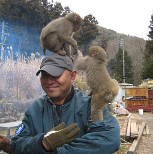 動物に好かれる彼。すぐに猿たちは彼を遊び場にしてしまいます。