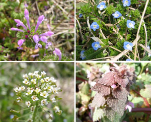 ホトケノザ、オオイヌノフグリ、ナズナ、ヒメオドリコソウ。