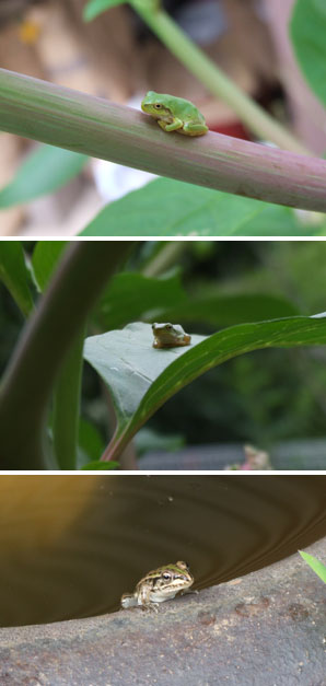 1.5センチのアマガエルがけなげに茎や葉に留まっている。