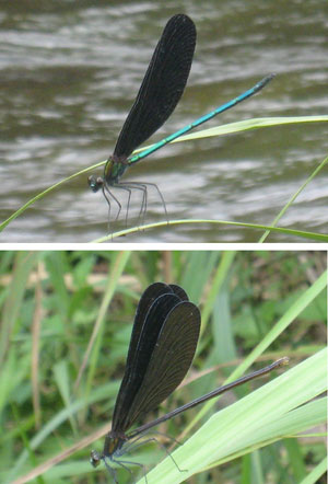 河原に座っているとハグロトンボがいっぱい寄ってくます。
