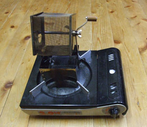 生豆を焙煎機に入れ、コンロにかけてくるくると回しながら豆に熱を与えます。
