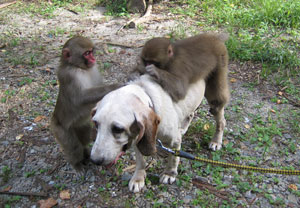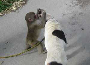最近、猿と犬は別居状態ですからいっしょになったここぞとばかり体中をチェックし、犬についたダニやノミを取りはじめます。