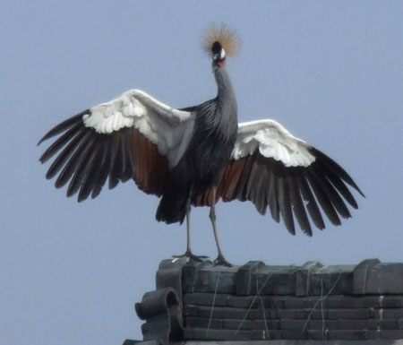 3月1日 近所の民家の屋根にツル発見。 なんとホオジロカンムリヅル・・・・アフリカのツルがどうしてこんなところに。 動物園から脱走したのか渡りの途中で迷子になったのか・・・・ 屋根の上と近くの畑で1時間くらいは観察できたでしょう。 近くの動物園に連絡してみると動物園からの脱走ではないらしい。何回か目撃証言が寄せられているとのこと。たぶんペットが脱走したのではとの答え。
