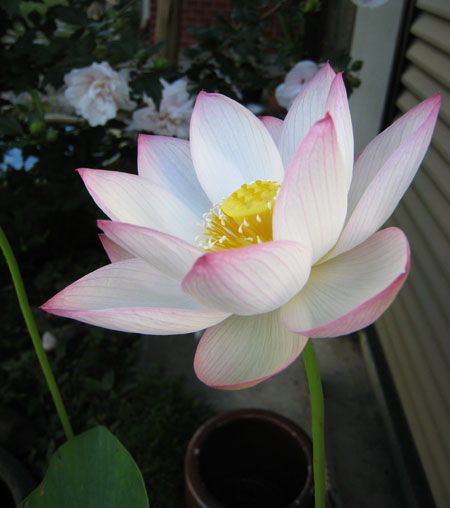 4年程前にレンコンをいただいて水鉢に植えました。毎年葉は出るもののいっこうに花をつけませんでした。まあ植えただけでなんの世話もしないからしかたなかったのかもしれませんが今年始めて蕾を付けました。無事に咲くものか心配していましたが今朝開花しました。