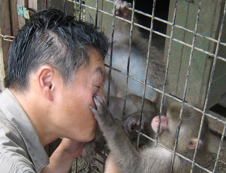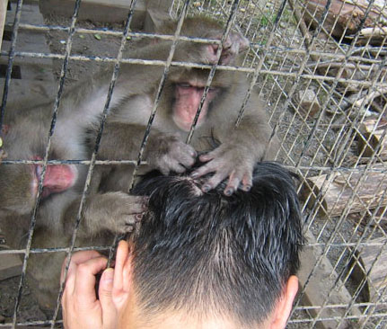 金網に頭をつけるとすぐにグルーミングが始まります。猿にとってグルーミングは挨拶みたいなものなのだろうな。