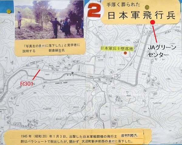 1945.1.3午後、B29を追撃したと思われる日本軍戦闘機のパイロット田中太郎大尉は、 脱出したがパラシュートが開かず下山村のR301脇の農地に落下し戦死された。 パラシュート開かずの原因は、尾翼に引っかかった?と、洞樹院の住職(当時13歳)はいう。 写真左上:2012.1.25の見学会で説明する地元の朝倉嗣喜氏、 田中大尉は、頭から墜落し農地に突き刺さったという。