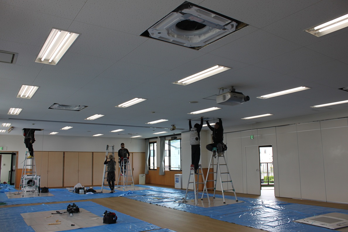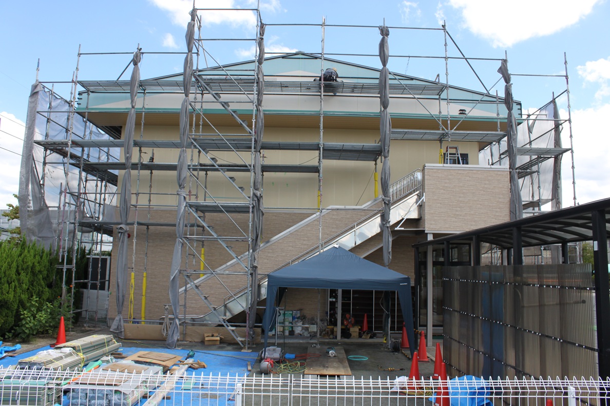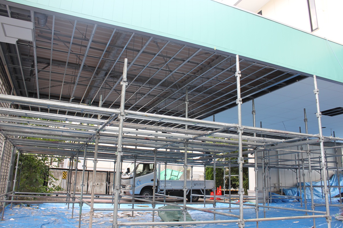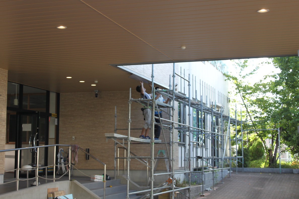 園舎2階の軒天部分の落下防止工事(耐震補強)や酷暑対策の一環として、涼霧ミストシステムの設置・1階廊下窓サッシ部分へ遮光シェードの設置等を行っております。