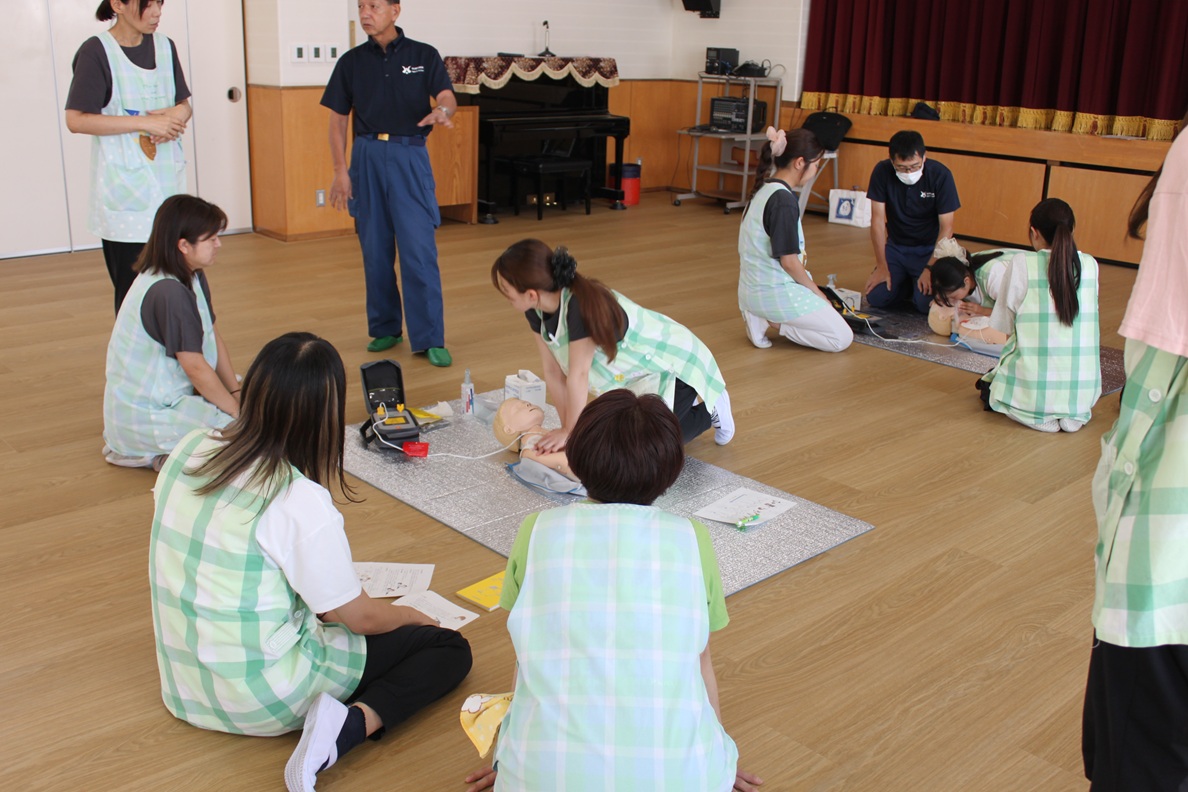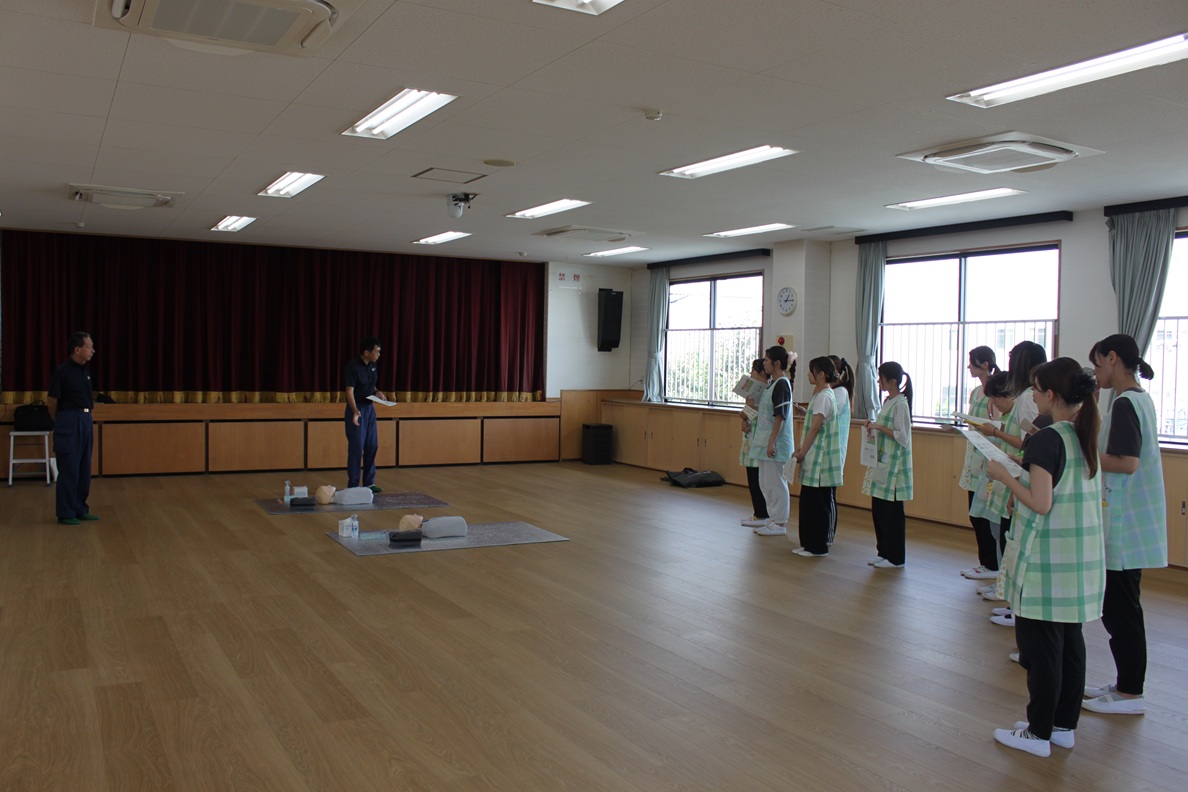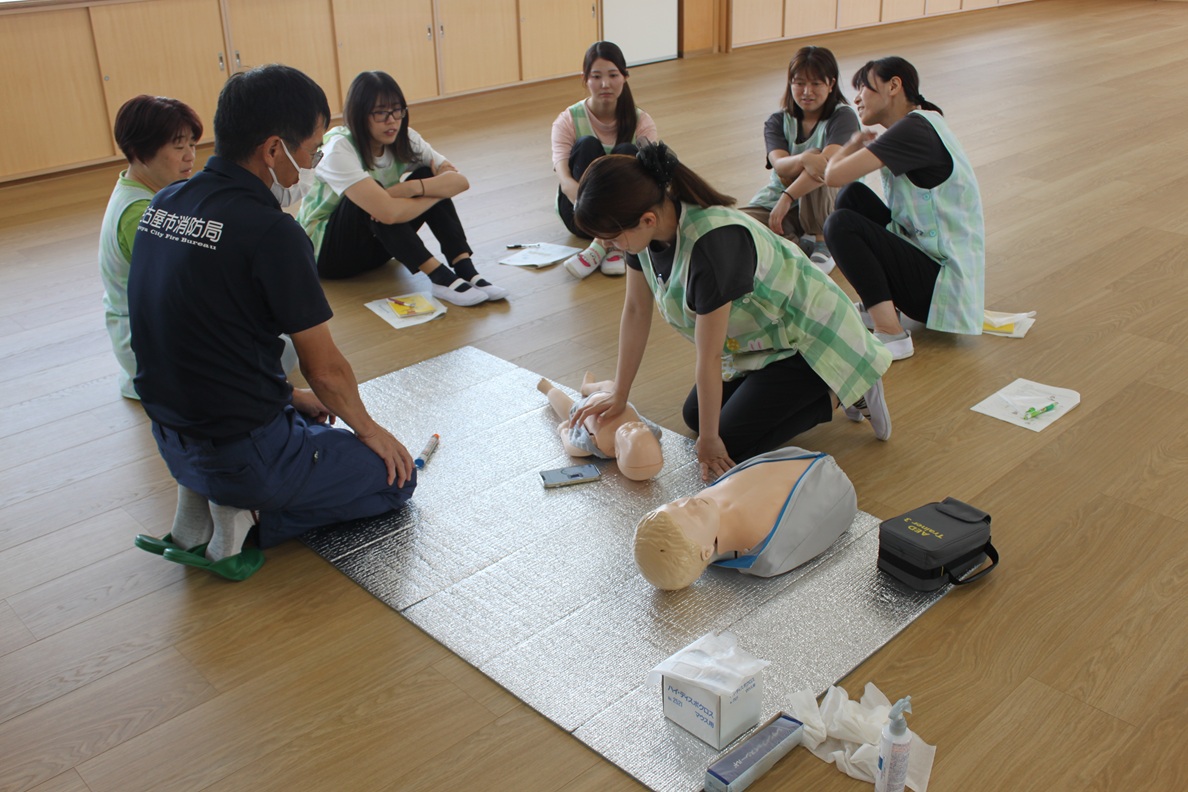 守山消防署様より一般救急の講師をお招きし、定期的に教職員へ心肺蘇生・AED・エピペン等の使用手順等の指導を行っていただいております。