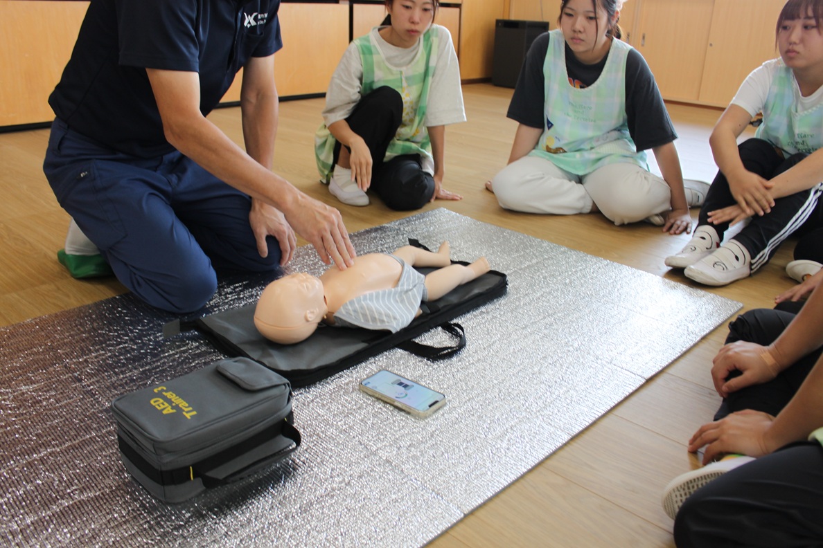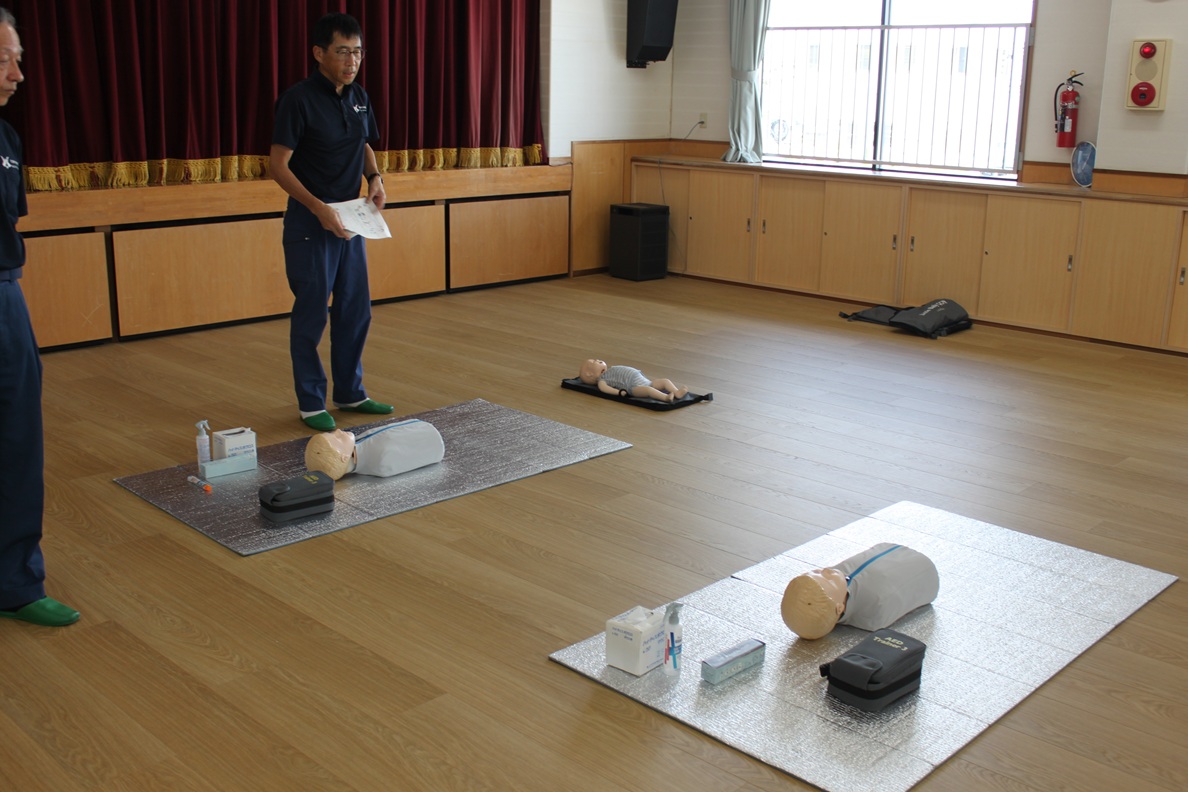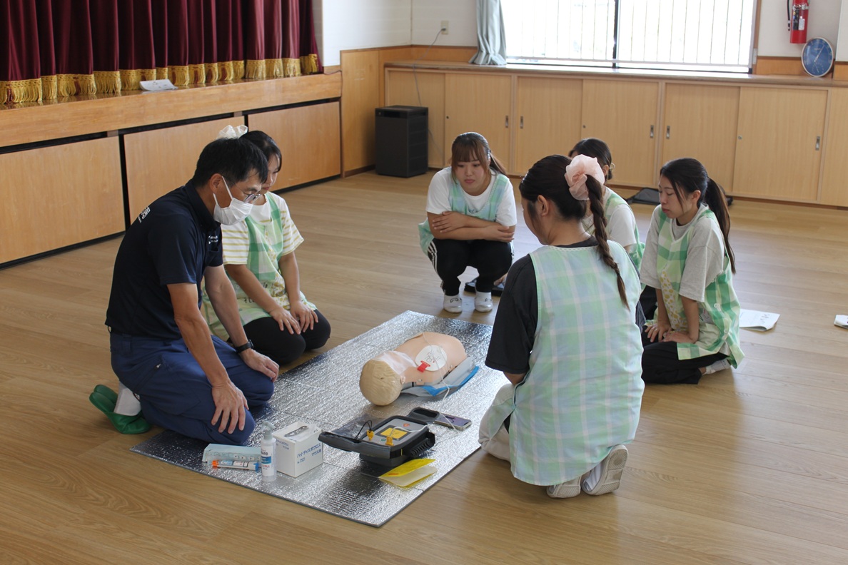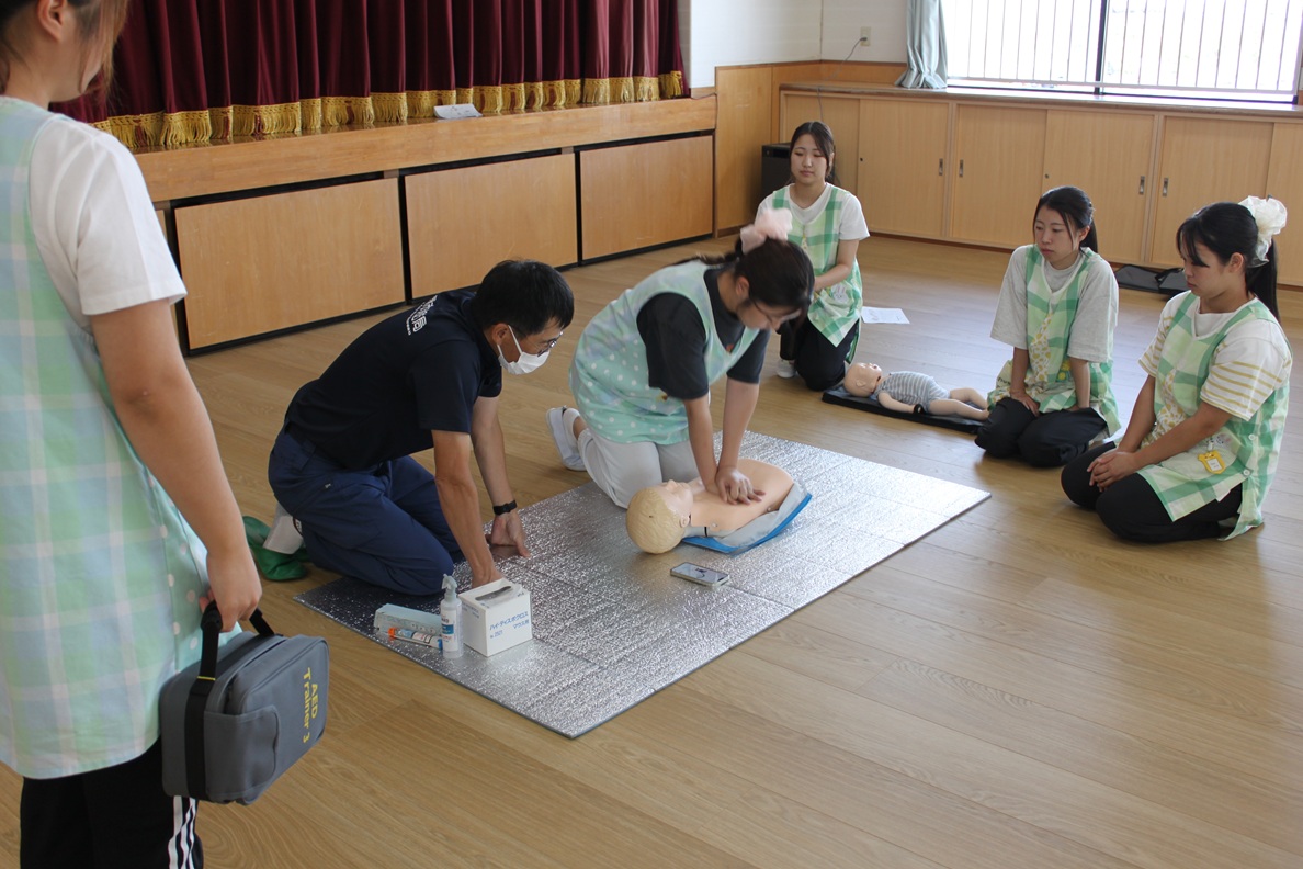 守山消防署様より一般救急の講師をお招きし、定期的に教職員へ心肺蘇生・AED・エピペン等の使用手順等の指導を行っていただいております。