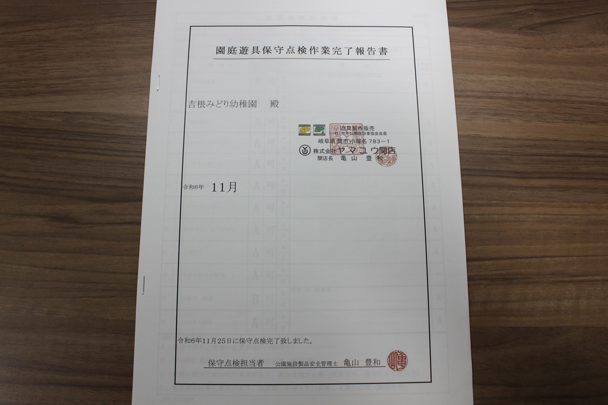園庭遊具につきましては毎年、公園施設製品安全管理士の方に定期点検を行っていただいております。