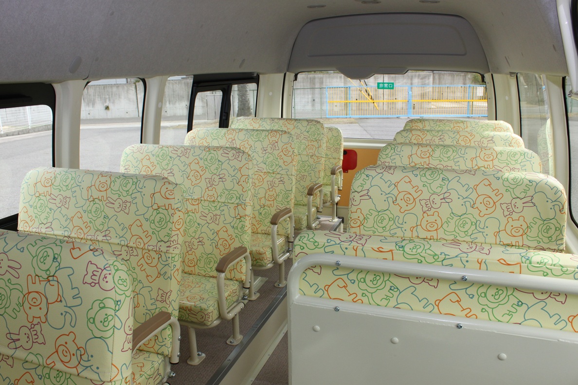 写真上のスクールバス(ハイエース 園児23名乗り)は、主に志段味東・上志段味小学校内と尾張旭市の白鳳・城山小学校区内(一部地域を除く)で運航しています。