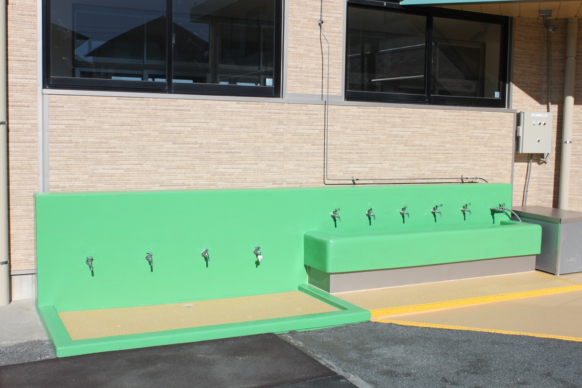 園児用手洗い場については、クッションコーティングシステムを導入し、転倒や衝突時の衝撃を緩和するようにしています。