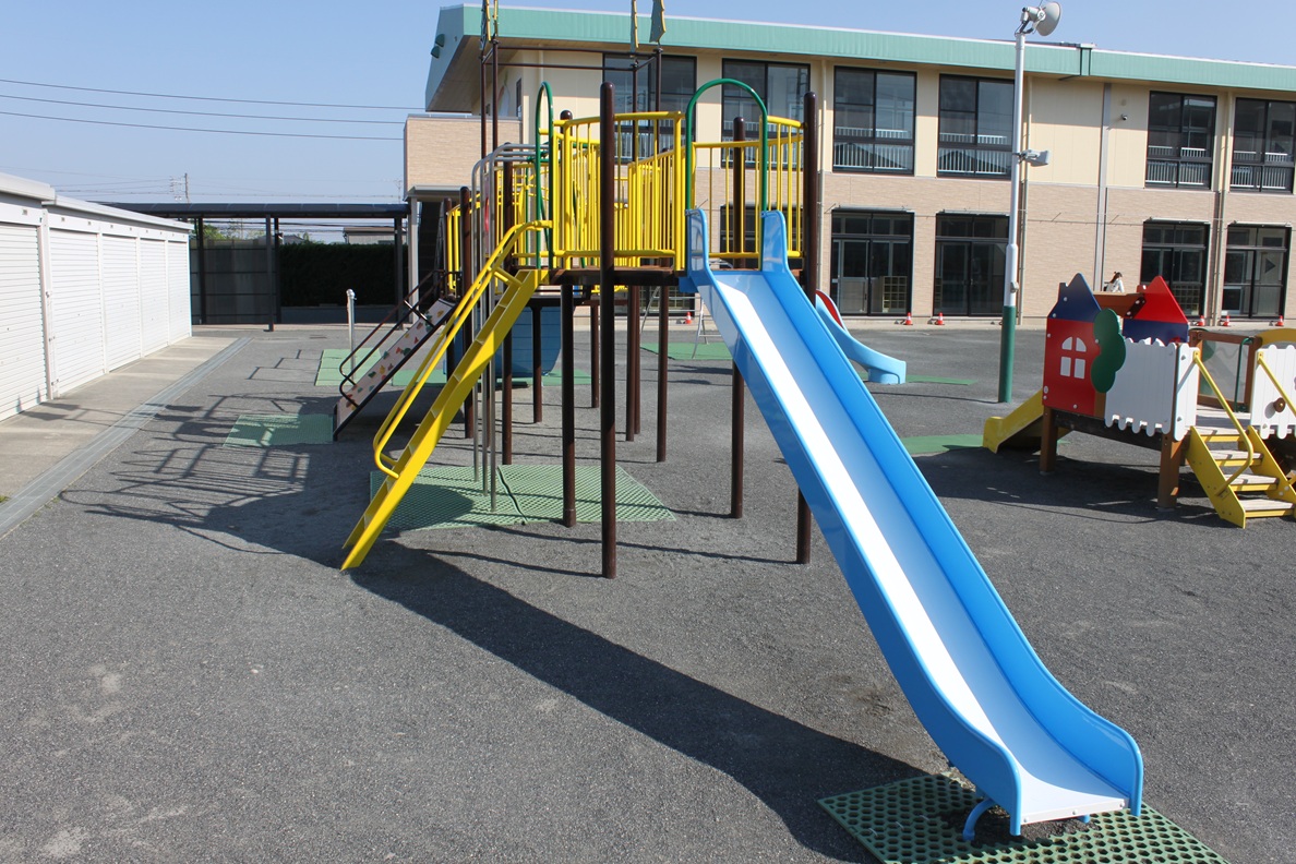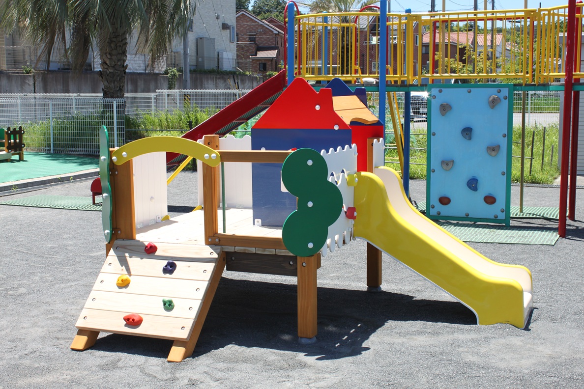 総合遊具の一部改修(すべり台交換・座面遮熱塗料塗布)、園庭遊具の園児用ベンチの追加設置工事が完了いたしました。