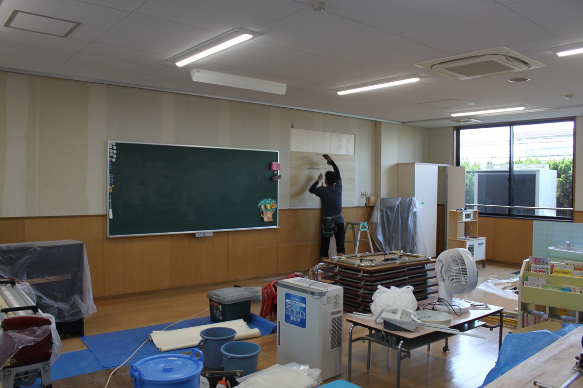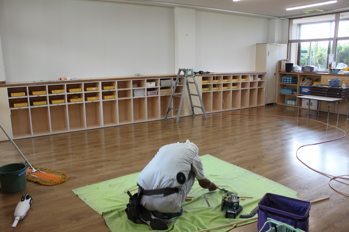 園舎1階保育室(5教室)の壁面クロスの張替・ロッカー金具補強・手洗い場の改修工事が完了いたしました。
