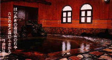 <湯殿>大木作りの六角風呂と、溶岩作り の溶岩風呂の2種があります。 湯殿は午後9時に男女交換し、 両方をお楽しみ頂けます。 この六角の湯殿は明治時代の歌 にも歌われていたものを再現しま した。 はつあきの霧積山の石亭 六方のまど霧にふさがる 与謝野晶子 | |||||||||
