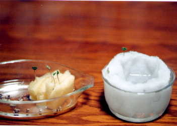 9/4種蒔きその後 ポリ綿、スポンジに蒔いて水につけたら2日目に発芽。ブロッコリーの発芽は早いとあったがホントだ。 隣が気になる |