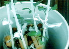 この京菜の成長を見よ!ブロッコリーはちょっと負けている気がしないでもないが、これからである。 くやしかったら京菜を見せてみよ。スゴイだろ!!「わっはっはっ」である。 ところで、BUKUさんの写真を見たらブロッコリー一本一本にストローのようなものが添え木のように 着いていたがあの怪しいジグは何なんだろう。とて〜も気になる。 ←ENTER(ukiさんの遠吠えと写真の拡大) |