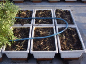 9月28日京菜の間引き BUKUさん、京菜萎れてしまったそうですね。残念ですね。 ところで、当方の京菜は相変わらず元気ですよ。と挑発をしたところで進捗状況報告です。 余りにも京菜が元気で(しつこい!)密集してきたので、小さい京菜を移植した。それでもまだこんなに溢れん ばかりである。(大変しつこくて失礼) |