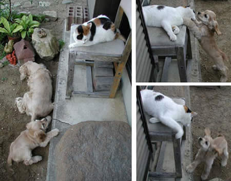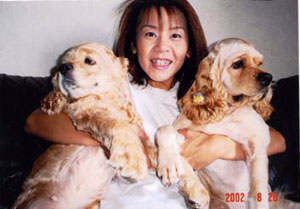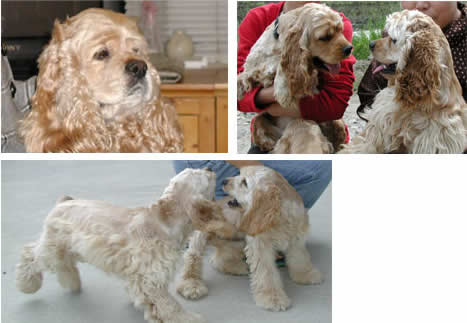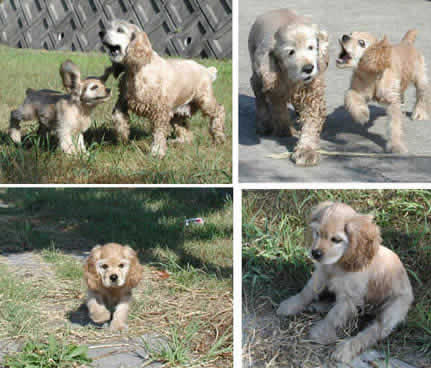 その後の小犬 養子に行った子犬たちがたまに里帰りしてきます。グーフィー(左上)やポテト(右の写真の左)ラム(下写真左)と言ったカワイイ名前をもらい、可愛がってもらっています。 |