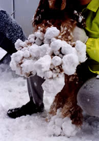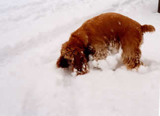 雪 寒いのは大好きなAコッカ、大雪が降り大喜びで外を走り回ったら雪玉が腹や足にくっつきどうにも動けなくなった。 野生では生きていけないAコッカ・・・。 |