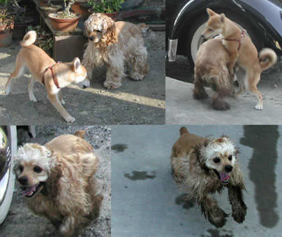 タロと遊ぶ 2003.6 柴犬タロがあそびに来ました。同い年のタロとプリンは遊ぶ遊ぶ、プリンは走って暑くなると川に飛び込み体を冷やし、またまた走る走る。いつまでもいつまでも追いかけっこをして遊んでいました。明らかにタロは日本人、プリンは西洋人。国際親善なのか民族の誇りをかけての追いかけっこなのか、なかなか見応えのある走りでした。 |