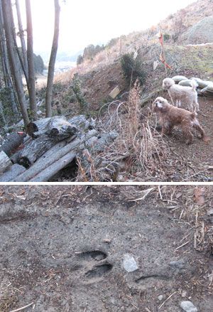 2月20日 我が家の犬の散歩コースは山あり川有りのコースです。 散歩コースには鹿などの野生動物の足跡がいっぱいです。犬の足跡よりよほど多いでしょう。 |