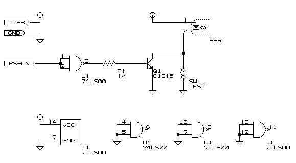 PS-ON信号はLS-TTLで受けます。また、PS-ON信号は"L"で電源ONとなるので、反転を兼ねて74LS00を使用しておりますが、74LS04等でも良いでしょう。LS-TTLですので未入力信号の処理は不要ですが、回路図例ではGND接続してあります。この基本回路では単純にPS-ON信号を反転、増幅してSSRを駆動する回路です。SSRの2次側は省略してあります。また、SSRが入手困難な場合はリレーを用いても良いでしょう。SSR選定時には電源の突入電流に十分耐える容量を選定する様、注意しましょう。最後に、この回路を駆動する電源は5VSB(電源OFF時にも供給されている5V電源)を使用して下さい。通常の5Vを使用しますと、当然ですが動作しませんので。^^;