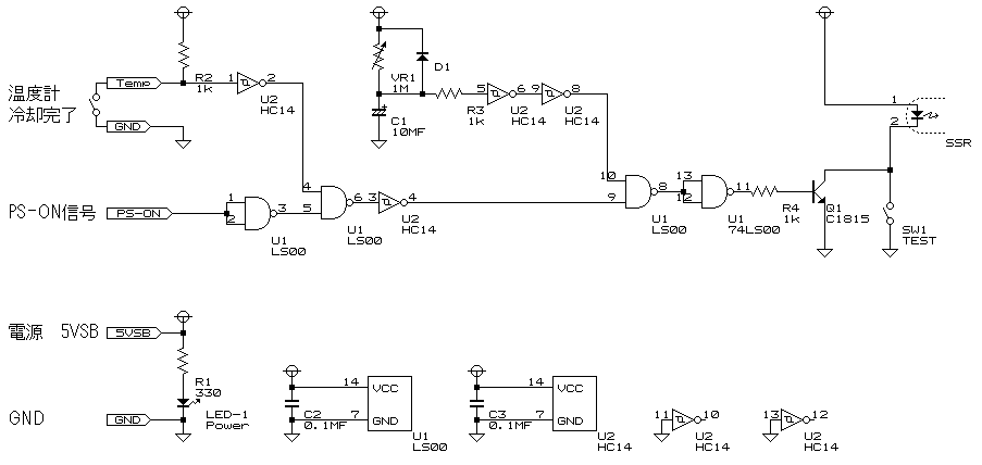 付加した機能はタイマ回路、ペルチェ冷却の予備冷却完了待ち回路です。タイマ回路は単純なCRタイマをシュミットで受けただけの回路です。情けない回路ですが、手持ち部品で作ったので、この回路となりました。このタイマは5VSB電源がON後、一定時間内はPS-ON信号を受付けない(電源をONさせない)為の回路です。一部のマザーでは、一次電源投入時に一瞬電源がONする現象が確認された為、この回路を採用しております。一次電源をON/OFFしない(コンセントに常時接続して常に5VSBが供給されている)場合は不要です。でも、私は自作のAC100V回路を常時接続するほど自信家でもないので^^;